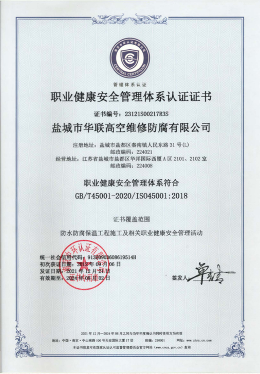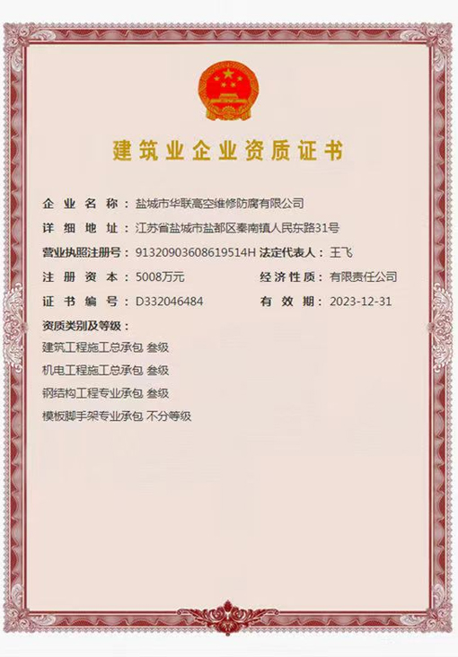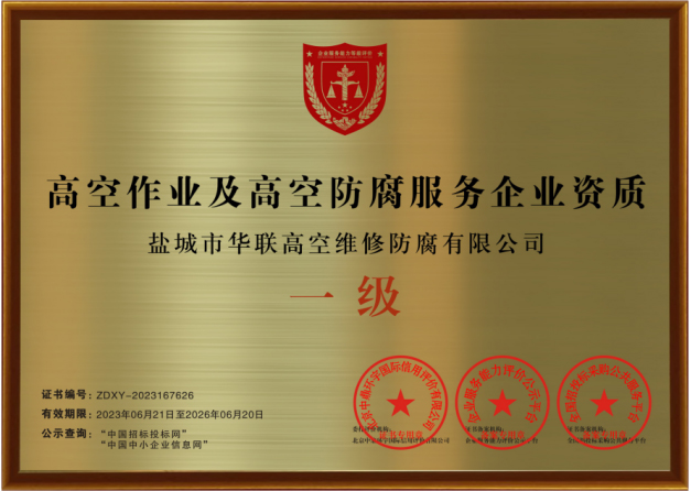 鹽城市華聯高空維修防腐有限公司始建于上世紀八十年代,系專業從事風力發(fā)電機塔筒防腐,塔筒維護,塔筒補漆,塔筒噴字等工程。不停產,不搭手架,高空懸吊施工的一級高空安全資質、一級高空防腐施工資質、二級建筑施工資質的高空建修、防腐工程、公司。現已發(fā)展集科研、設計、施工為一體的的江蘇省較大的高空建修,高空防腐施工企業;公司注冊資金3008萬元,流動資金8000多萬元;擁有高修技術科研高修工程設計、高修工程施工三大技術與施工組織體系;公司擁有一流的技術施工隊伍,其中有高級職稱36 名,中級職稱126人。具備一級防腐資質、一級安全資質及二級建筑資質,公司下轄五個分公司和十八個辦事處,為全國數百家企業解決了若干“高、大、難”的特殊工程項目,填補了我國建筑史上的空白。